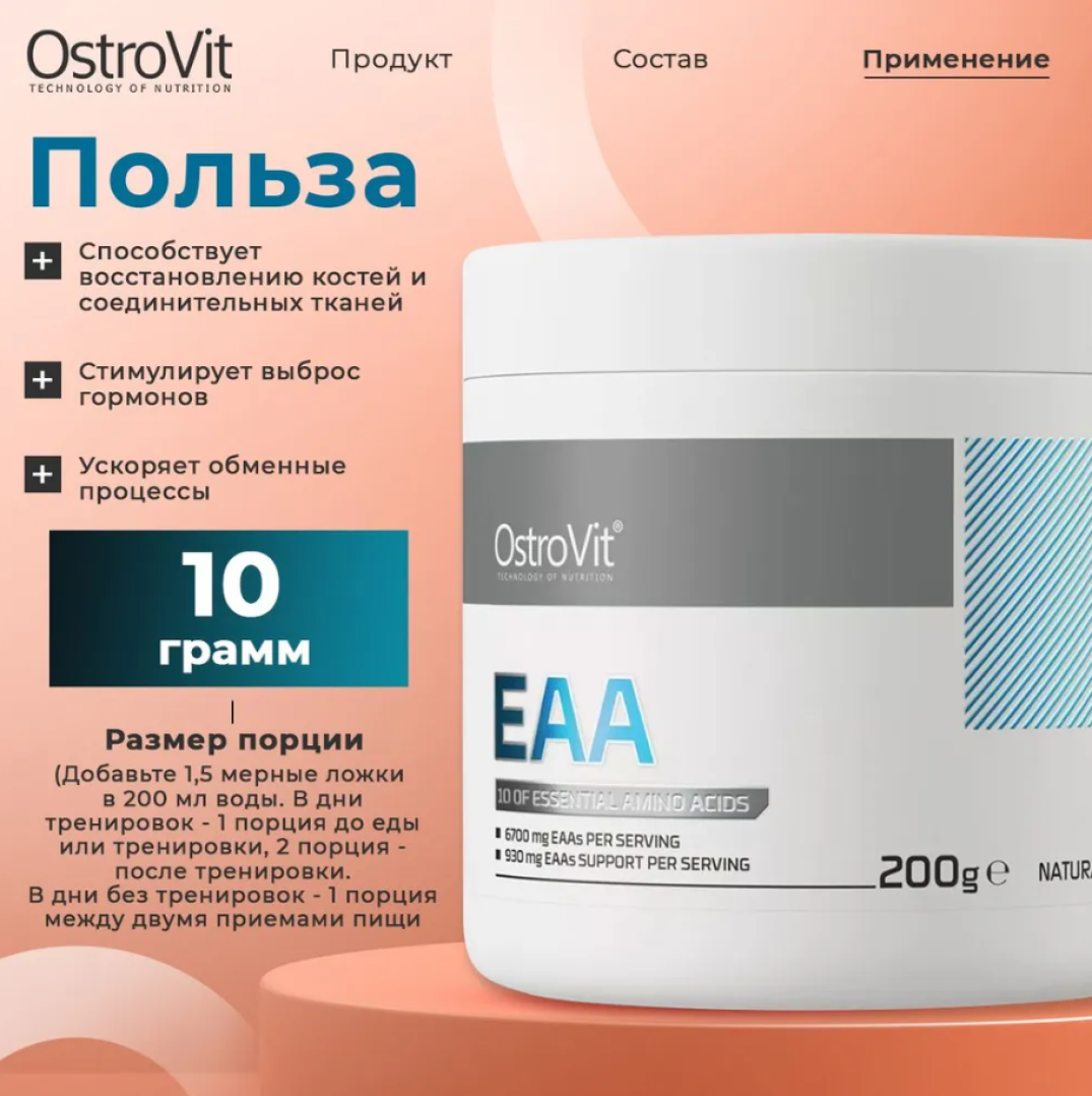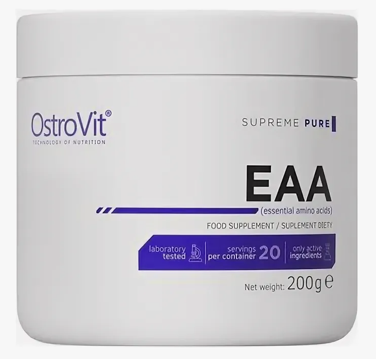 OstroVit EAA высококачественная биологически активная добавка, которая содержит 10 незаменимых аминокислот, в том числе L-лейцин, L-валин и L-метионин. Это препарат с простым составом и натуральным вкусом, доступный в удобной порошковой форме. Продукт предназначен спортсменам и людям, желающим дополнить свой ежедневный рацион ценными соединениями.