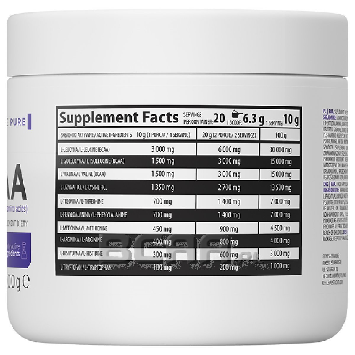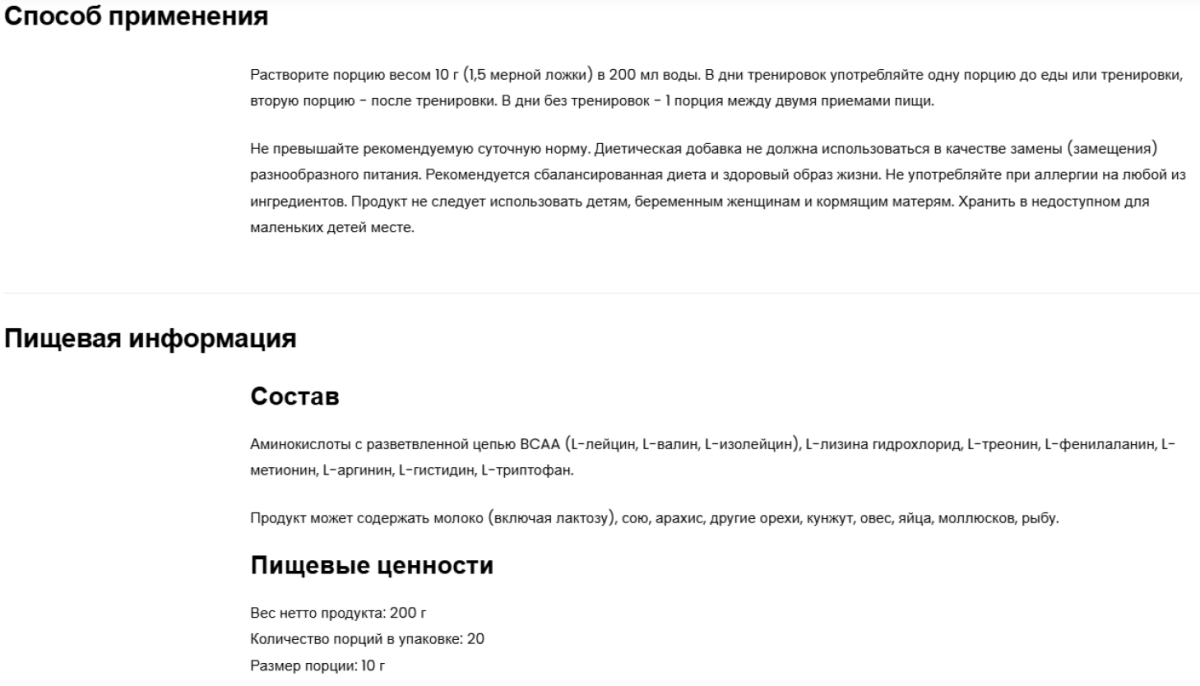 Источник незаменимых аминокислот - одна порция пищевой добавки обеспечивает организм 3 000 мг L-лейцина, 1 500 мг L-изолейцина, 1 500 мг L-валина и 1 350 мг L-лизина HCl, 700 мг L-треонина, 700 мг L-фенилаланина, а также 450 мг L-метионина и 400 мг L-аргинина. Кроме того, продукт содержит 300 мг L-гистидина и 100 мг L-триптофана..