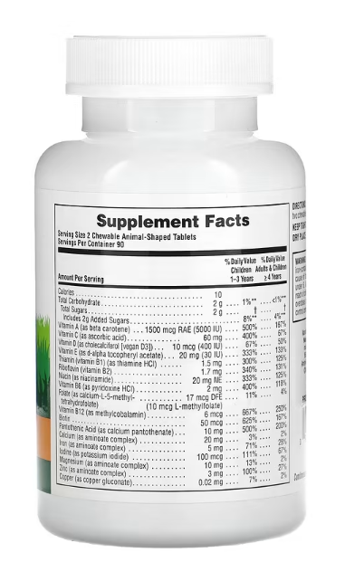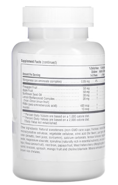 Натуральные подсластители (тростниковый сахар без ГМО, фруктоза), микрокристаллическая целлюлоза, лимонная кислота, целлюлоза (растительного происхождения), стеарат магния, натуральных ароматизаторов, карбонат кальция, гуаровая камедь, фумарат железа, фумарат магния, оксид магния, сок свеклы, спирулина (богатый природный источник питательных веществ), оксид цинка, плоды шиповника (Rosa canina), цитрат калия, цельный коричневый рис, плоды папайи, йодид калия, плоды мальпигии (Malpighia glabra), морковь, битартрат холина, аминоат калия, брокколи, шпинат и плоды манго. Минеральные аминоаты — хелаты из цельного коричневого риса.
