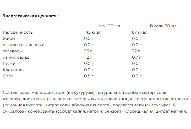 Энергетические гели c электролитами предназначены для обеспечения дополнительной энергии в течение интенсивных физических нагрузок, а также для восполнения потери минеральных солей при обильном потоотделении.