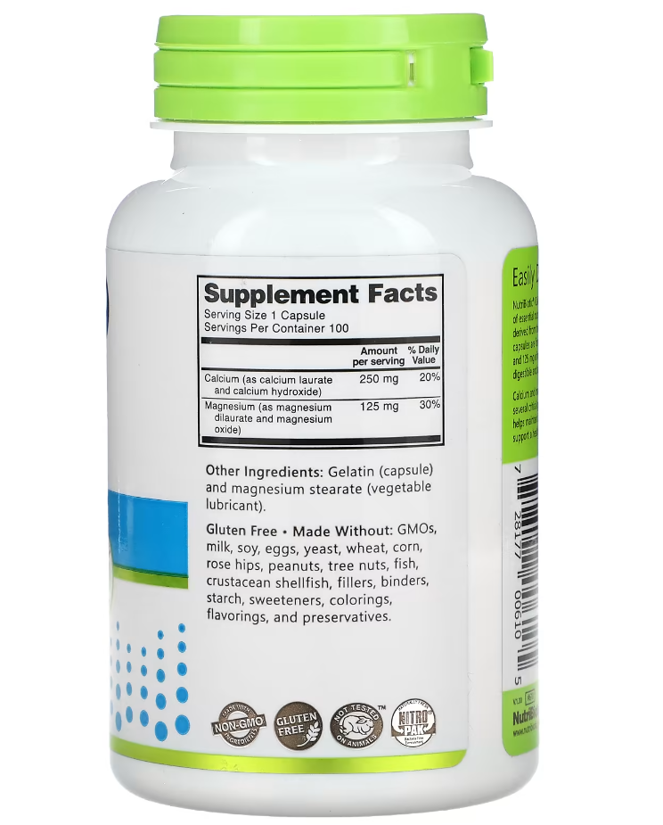 Капсулы кальция и магния NutriBiotic® содержат необходимые питательные вещества: кальций и магний, полученные из природных соединений. Эти капсулы содержат 250 мг кальция (в виде лаурата кальция и гидроксида кальция) и 125 мг магния (в виде дилаурата магния и оксида магния) на порцию. Они легко усваиваются.