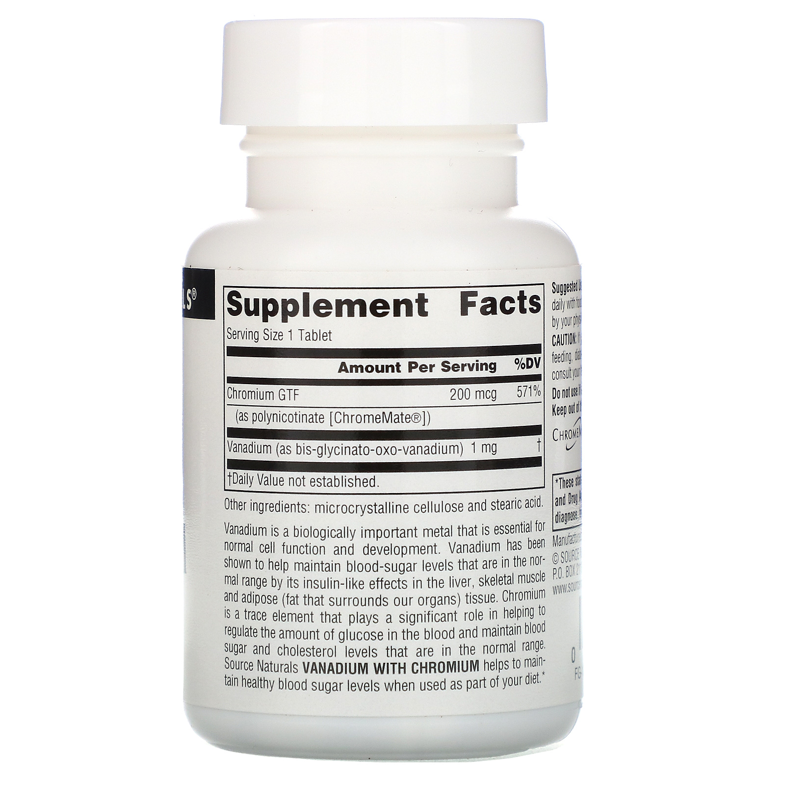 Ванадий — это биологически важный металл, необходимый для нормального функционирования и развития клеток. Ванадий помогает поддерживать нормальный уровень сахара в крови, действуя подобно инсулину в печени, скелетных мышцах и жировых тканях. Хром — это микроэлемент, который играет важную роль в регулировании уровня глюкозы в крови и поддержании уровня сахара и холестерина. Ванадий с хромом от Source Naturals помогает поддерживать нормальный уровень сахара в крови при условии применения на фоне здорового питания.