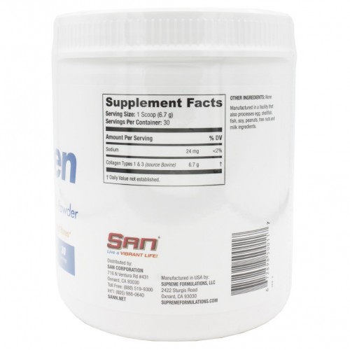 Прием SAN Collagen Types 1 & 3 Powder избавляет от дефицита коллагена, восполняет запасы белка. Добавка является строительным материалом для опорно-двигательного аппарата, тканей кожи. Она нормализует пищеварение, уменьшает аппетит и способс