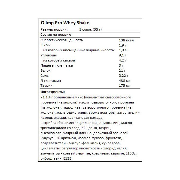 Протеиновый комплекс Pro Whey Shake от европейского бренда Olimp содержит широкий спектр быстро усвояемых протеинов с богатой пищевой ценностью, а также комплекс таурина и L-глютамина.