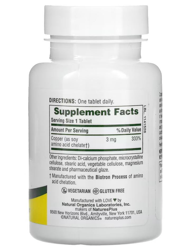 NaturesPlus Copper 3 мг – это премиальная пищевая добавка, которая снабжает организм медью, необходимым микроэлементом для поддержания крепости костей, здоровья сосудов, оптимального функционирования нервной системы и укрепления иммунитета. Медь активно участвует в синтезе коллагена, ускоряет процессы регенерации тканей и играет важную роль в регуляции обмена железа в организме.