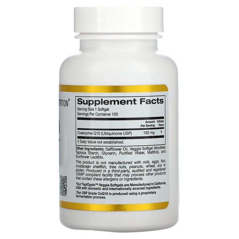 Коэнзим Q10 от California Gold Nutrition содержит 100 мг убихинона класса USP (CoQ10), который производится в США с применением запатентованного процесса ферментации, в виде растительных капсул TapiOgels™ из тапиоки.