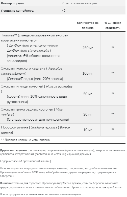 Не производится с ингредиентами пшеницы, глютена, сои, молока, яиц, рыбы или моллюсков. Произведено на объекте GMP, который обрабатывает другие ингредиенты, содержащие эти аллергены.