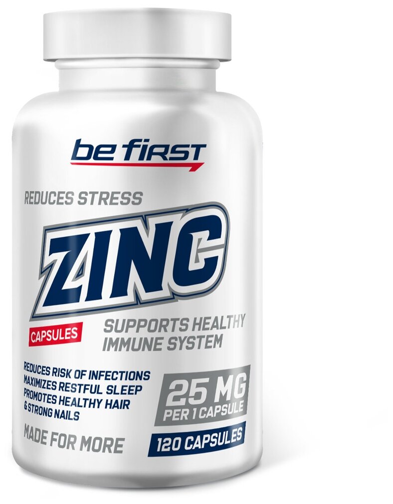 Be First Zinc (Цинк) – подспорье для тех, кто работает над увеличением мышечной массы и при этом желает позаботиться о своем здоровье. Препарат особенно рекомендуется при несбалансированной и вегетарианской диете.