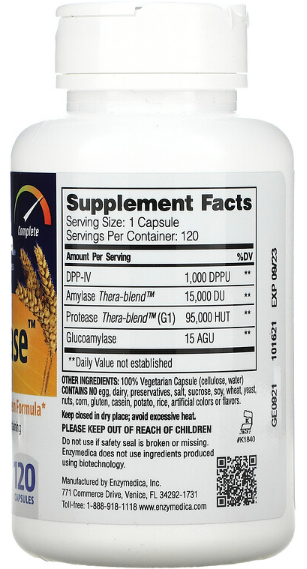 GlutenEase™ содержит Protease Thera-blend™ (G1) вместе с активностью DPP-IV для улучшения переваривания продуктов, содержащих глютен и казеин. Ферменты амилазы, переваривающие крахмал, помогают переваривать углеводную часть зерна, такого как пшеница, которая содержит глютен.