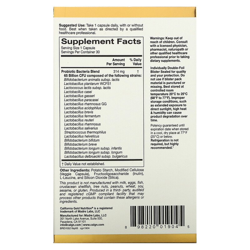 Пробиотики Lactobif® 65 от California Gold Nutrition содержат 20 активных штаммов пробиотиков, в том числе 15 штаммов молочнокислых бактерий и 5 штаммов бифидобактерий. Каждая вегетарианская капсула содержит 65 млрд КОЕ, чтобы доставлять в организм эффективное количество полезных бактерий и поддерживать нормальный микробный баланс.