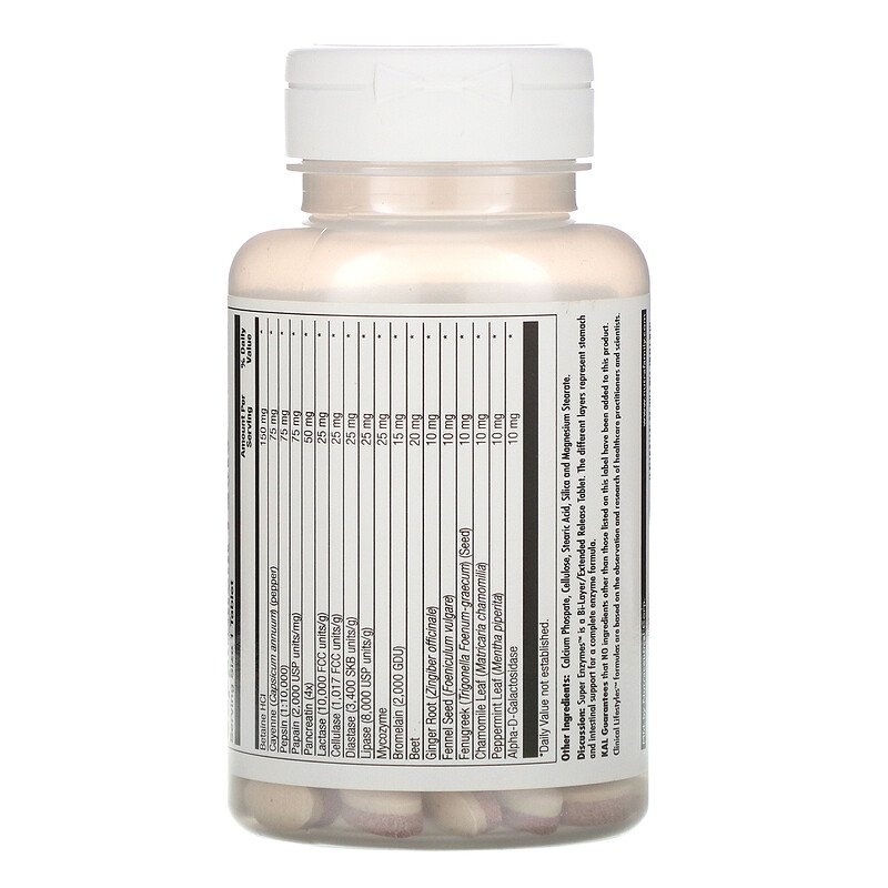 Super Enzymes – это двухслойная (с длительным высвобождением) таблетка. Различные слои представляют полный комплекс ферментов для поддержки здоровой функции желудка и кишечника.