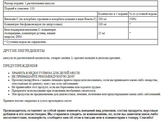 Для формулы витамина С, которая работает лучше, Solaray создала богатый питательными веществами комплекс аскорбата стронция и аскорбата кальция с l-треонатом. В результате получается некислотная формула, которая быстро действует и действует долго, при этом оказывая мягкое воздействие на желудок. Мы также добавили биофлавоноиды для усиления действия витамина С и другие ключевые ингредиенты для создания синергетической базы поддержки для максимальной биодоступности и эффективности.