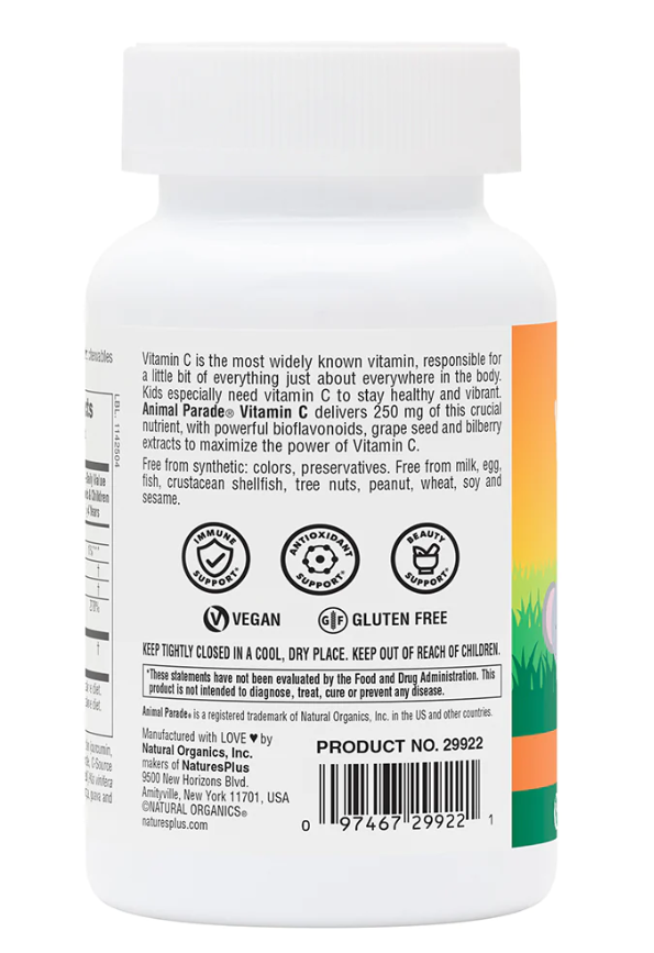 Витамин C без сахара Animal Parade — это сладкая формула с витамином C со вкусом апельсинового сока, изготовленная из концентратов цельных продуктов. В этот особый состав с витамином C для детей входят биофлавоноиды из цитрусовых, экстракты виноградных косточек и черники, а также концентраты манго и папайи. Включите новую вкусную добавку с витамином C Animal Parade в повседневный рацион своих детей — они и не догадаются, что она без сахара! Попробовав жевательные таблетки Animal Parade с восхитительным вкусом апельсинового сока хотя бы один раз, они сами будут просить у вас добавку каждый день!