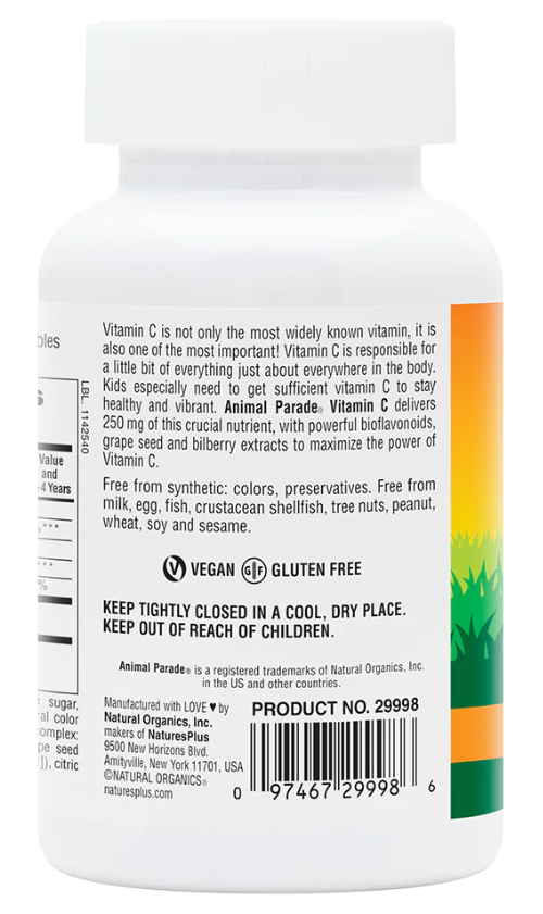 Витамин C Animal Parade состоит из концентратов цельных продуктов. В состав этой особой смеси с витамином C для детей входят биофлавоноиды из цитрусовых, экстракты виноградных косточек и черники, а также концентраты манго и папайи. Включите новую вкусную добавку с витамином C Animal Parade в повседневный рацион своих детей. Попробовав жевательные таблетки Animal Parade с приятным вкусом апельсинового сока хотя бы один раз, они сами будут просить у вас добавку каждый день.
