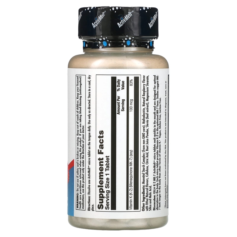 KAL Vitamin K-2 MK-7 100 мкг реализуется в таблетированной форме. Таблетки рассасывающиеся, приятные на вкус. Рекомендуются, если есть трудности с проглатыванием капсул.
