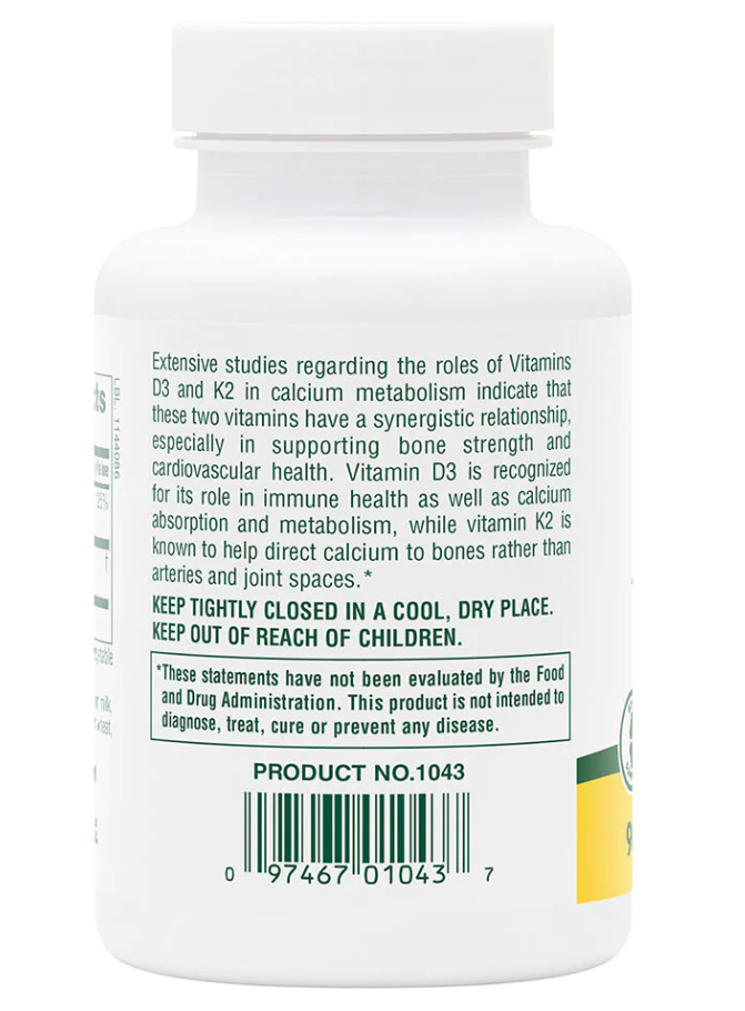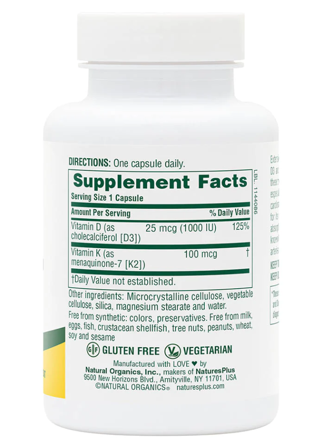 NaturesPlus Vitamin D3 & K2 представляет собой уникальный дуэт жизненно важных витаминов, которые необходимы для укрепления костей, поддержки сердечно-сосудистой системы и повышения иммунитета. Витамин D3 обеспечивает эффективное усвоение кальция, а витамин K2 способствует его правильному распределению, направляя кальций в костную ткань и предотвращая его накопление в стенках сосудов. Этот сбалансированный комплекс станет идеальным выбором для людей, стремящихся поддерживать здоровье и предотвращать нехватку витаминов.