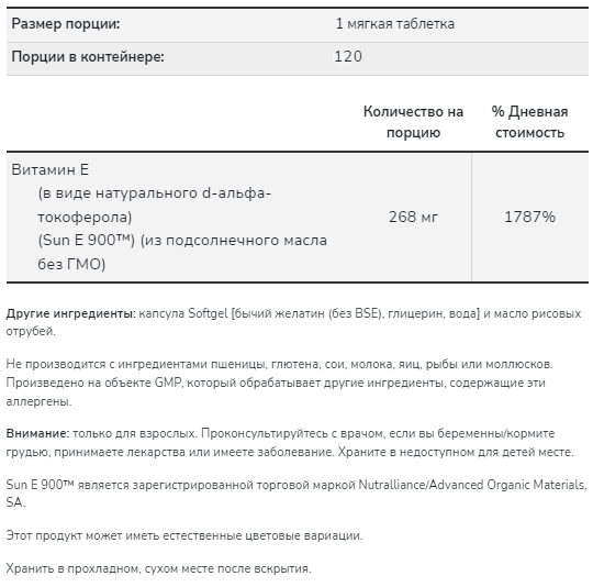 капсула Softgel [бычий желатин (без BSE), глицерин, вода] и масло рисовых отрубей.