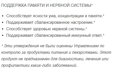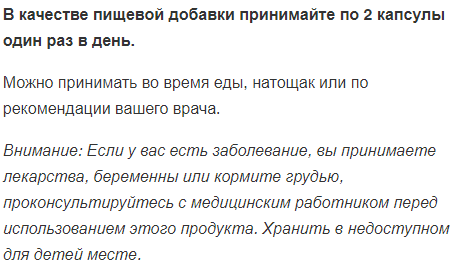 Продукт не является лекарственным средством и не предназначен для лиц моложе 18 лет, беременных и кормящих женщин. Перед приемом проконсультируйтесь с врачом. Не превышайте указанную дозировку. Меры предосторожности: хранить в недоступном для детей месте. Продукт не является заменителем пищи. Не следует превышать рекомендуемую дозировку. Производитель не несёт ответственности за любой вред, причинённый в результате ненадлежащего использования или хранения продукта.