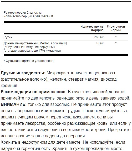 Продукт не является лекарственным средством и не предназначен для лиц моложе 18 лет, беременных и кормящих женщин. Перед приемом проконсультируйтесь с врачом. Не превышайте указанную дозировку. Меры предосторожности: хранить в недоступном для детей месте. Продукт не является заменителем пищи. Не следует превышать рекомендуемую дозировку. Производитель не несёт ответственности за любой вред, причинённый в результате ненадлежащего использования или хранения продукта.