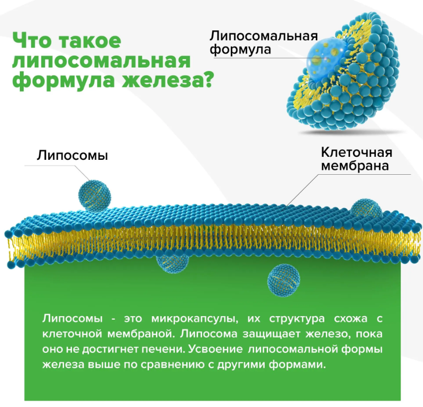 Также одним из преимуществ липосомальной формы железа является высокая степень усвоения. Липосомальное железо усваивается в 3,5 раза лучше, чем железо в форме свободного пирофосфата, и в 2,7 раза лучше, чем сульфат железа.