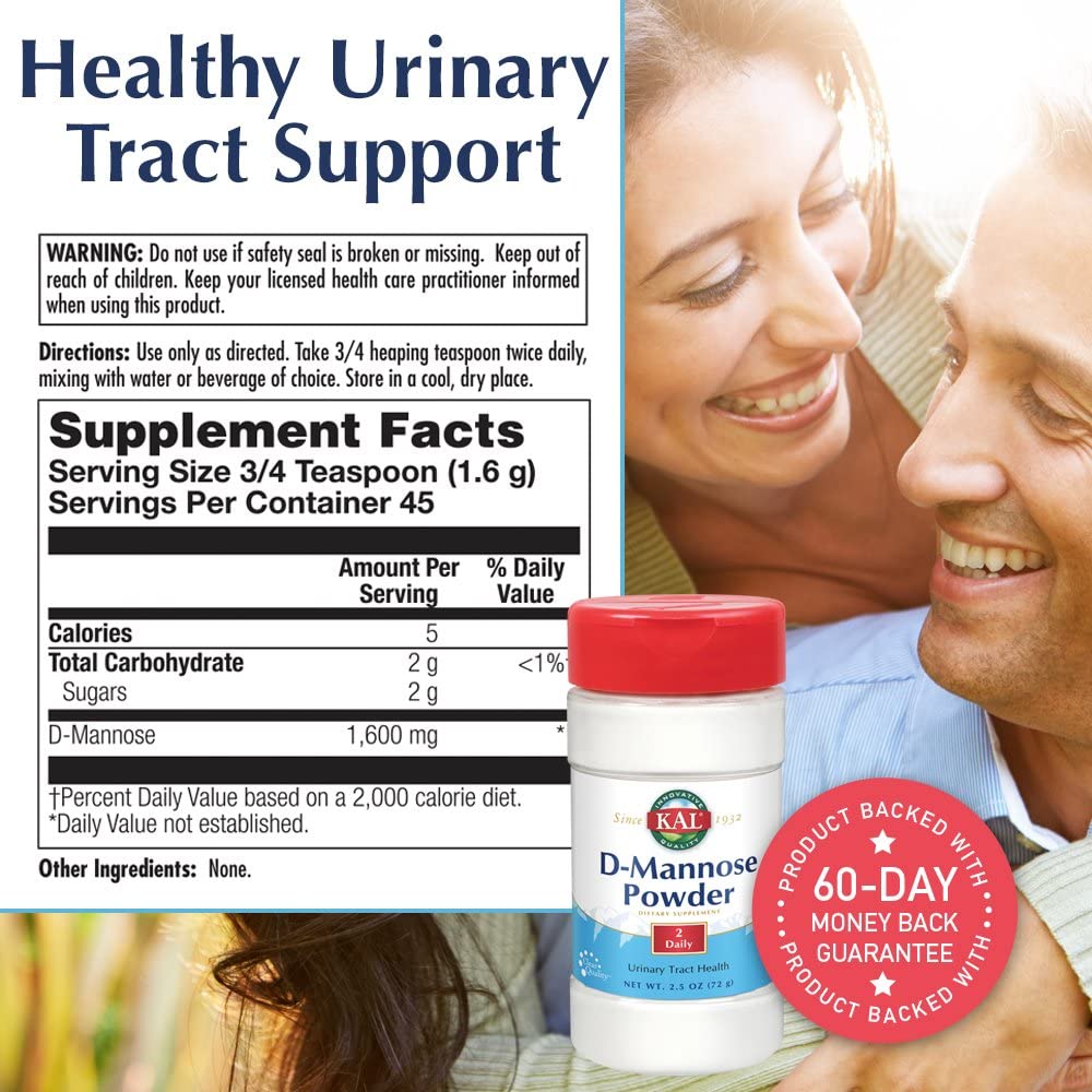 KAL D-Mannose Powder 1600 мг (Порошок Д-Манноза) – это простой сахар d-манноза, который может выступать в качестве подсластителя для нужных напитков. Другой аспект действия продукта – это способность выводить токсичные вещества из мочевого пузыря. Также не позволяет кишечной палочке прикрепиться к стенкам мочевого пузыря и вызвать воспаление. К плюсам д-маннозы относится то, что она вымывается из организма с мочой в неизменном виде, у нее не отмечается негативного действия на мочевыделительную систему. В естественной природе вещество встречается в составе ясеня маннового. Частично расщепляется при процессах гликолиза, также служит пищей для полезных микроорганизмов.