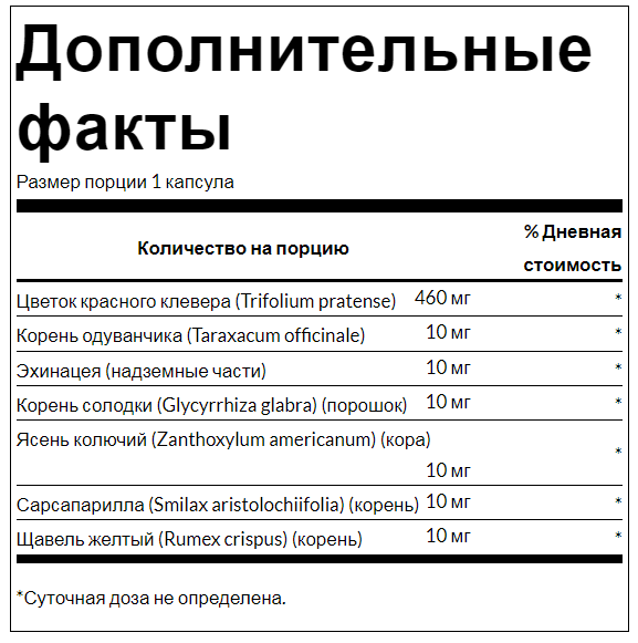 Комбинация красного клевера Swanson, созданная для выведения токсинов и повышения защитных сил организма, объединяет восемь очищающих трав, в том числе цветы красного клевера, корень одуванчика, лист эхинацеи, корень солодки, кору персика, ясень колючую, корень сарсапарели и желтый корень дока.